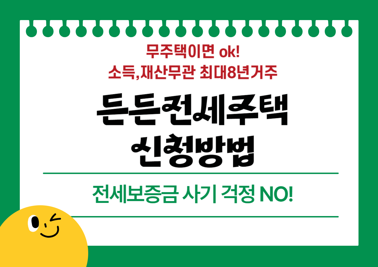 든든전세주택은 최대8년까지 거주가능한 정부보증 전세주택 사업으로 무주택자라면 누구나 신청가능하면 소득과 재산을 따지지 않습니다.