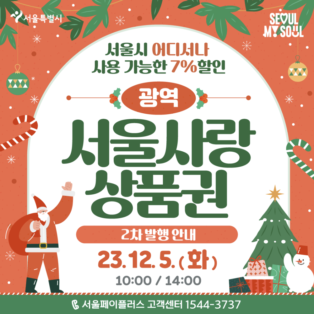 7%할인금액으로 구매가능하며 사용금액의 30% 소득공제가 가능하기 때문에 1석2조의 혜택이 있는 서울전지역에서 사용가능한 광역서울사랑상품권 구매 놓치지마시고 12월5일 꼭 구매성공하세요!