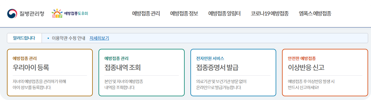 질병관리청 예방접종 도우미에 접속하여 본인과 자녀의 예방접종 내역을 모두 확인하실 수 있습니다.