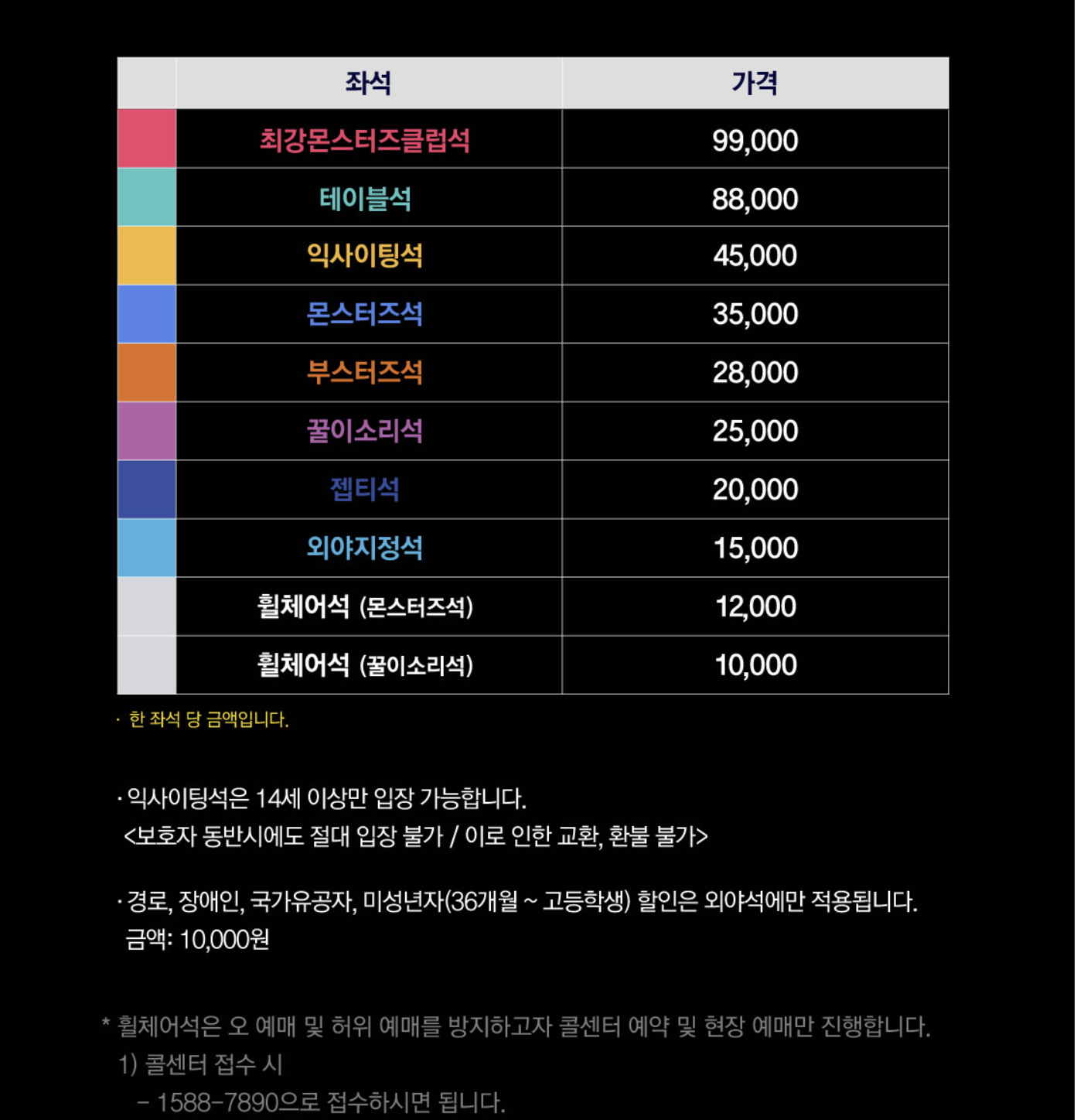 티켓 가격: 외야지정석 15,000원 ~ 최강몬스터즈 클럽석 99,000원