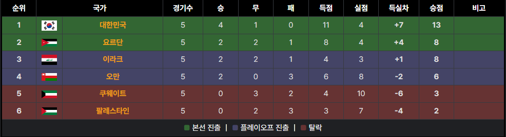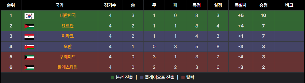 이번경기의 상대인 팔레스타인은 2무3패로 승점2점으로 위입니다.