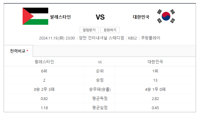 한국과 팔레스차인 축구 중계는 독점권을 가지고 있는 쿠팡플레이에서 시청이 가능하고 정규방송은 KBS2채널을 통해 시청 하실수 있습니다.