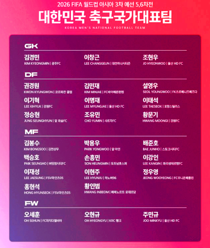 아래는 이번11월 경기에 참여한 대한민국 축구대표팀 명단입니다.